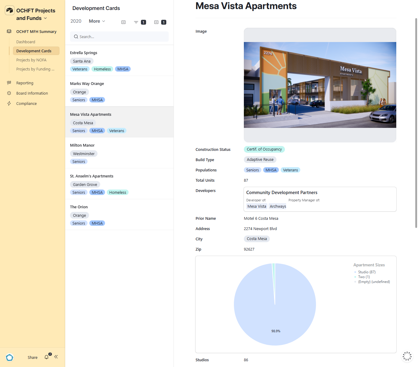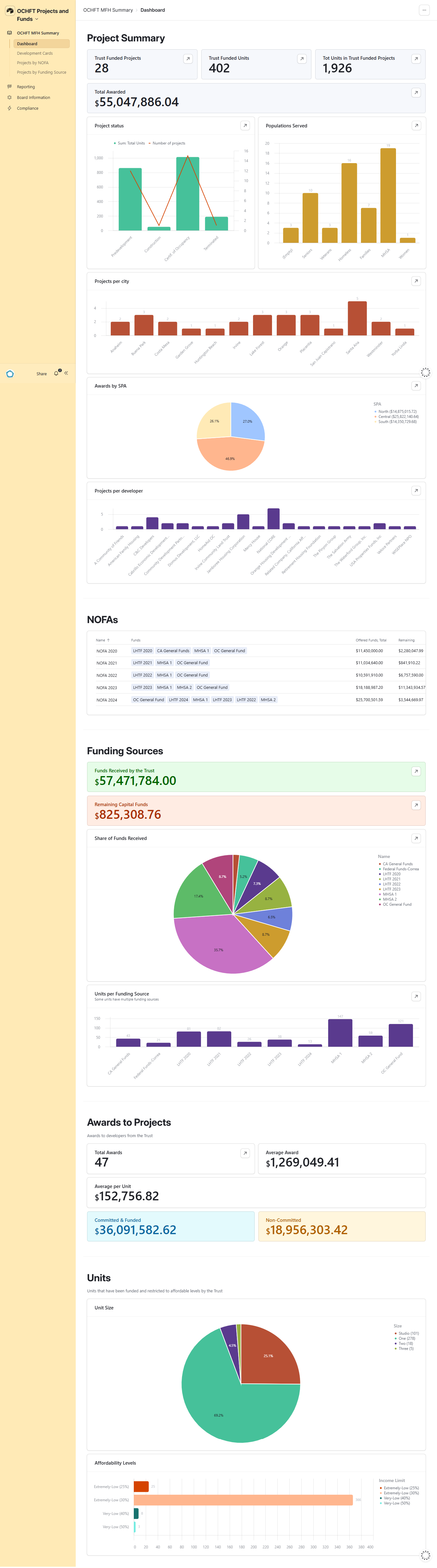 The Orange County Housing Finance Trust had experienced significant growth in the number of projects funded and grants received since its founding four years prior, but was still using a manually updated HTML chart on its website to track its work both externally and internally. The chart was often out of date, and the lack of any calculation capability forced staff to manually copy the data for every new reporting or administrative need, which created unnecessary extra work and introduced errors and variances in reported impact numbers.