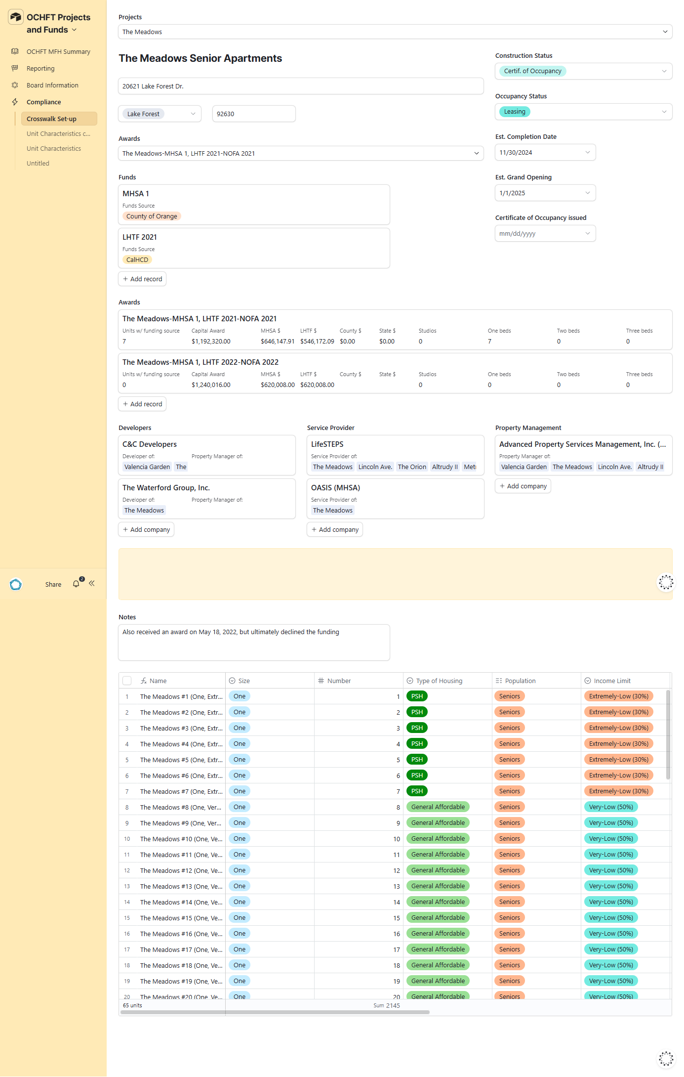 The custom-built Airtable database provides a comprehensive overview of the Trust's multifamily housing funding program. It features interconnected records related to grants received and the projects that they funded, pulling the information from thousands of pages of legal contracts, agreements, applications, and grant agreements. It is used to generate reports, monitor loan and construction progress, account for remaining grant funds, and transfer information from the Development Manager to the Compliance Manager. The database was designed from the start to be expandable to include funding sources from other government agencies (cities and the county) to streamline the regional management of publicly subsidized affordable housing projects.